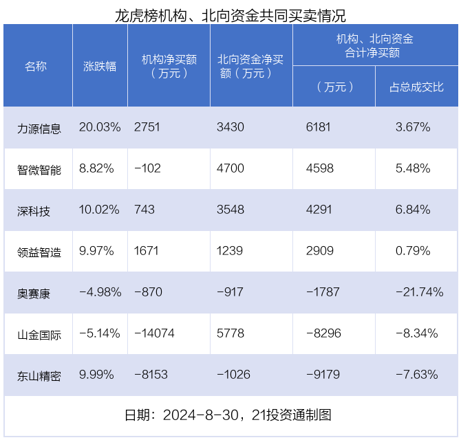 8月30日,上证指数上涨0.68%,深证成指上涨2.38%,创业板指上涨2.53%。盘后龙虎榜数据显示,共有41只个股因当日异动登上龙虎榜,资金净流入最多的是力源信息(300184.SZ),达2.06亿元。