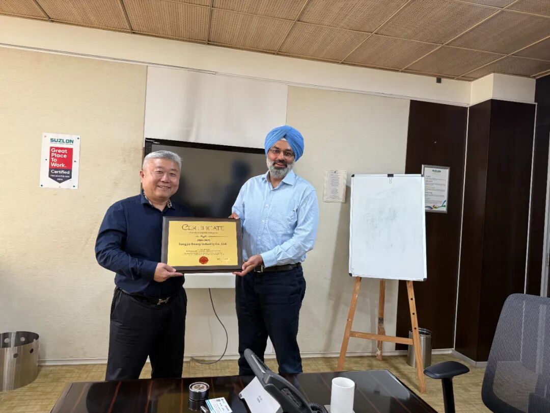 通裕重工与苏司兰、TD Power等客户的合作始于2005年,携手走过二十载风雨征程,共同见证了印度清洁能源产业的蓬勃发展。访问期间,苏司兰公司CEO Boparai先生亲自接待团队,并授予“合作二十周年纪念奖牌”,对通裕重工在产品质量、服务响应与战略协同方面给予高度认可。多家客户均表示,通裕重工是他们长期信赖的合作伙伴。