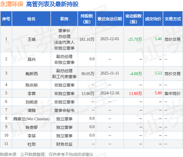 永清环保近半年内的董监高及核心技术人员增减持详情如下: