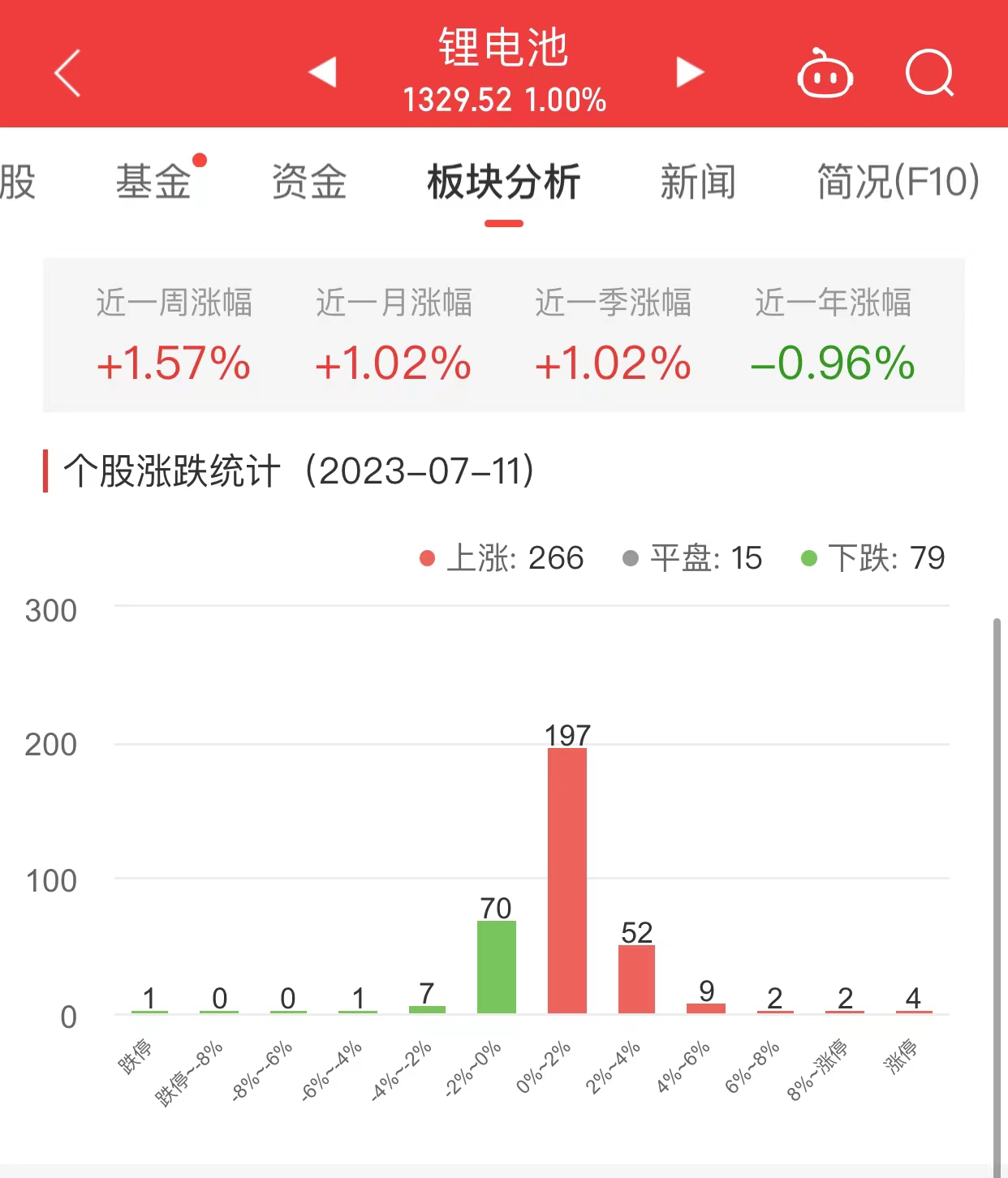 中国经济网北京7月11日讯今日,锂电池板块整体涨幅1%,其中266只股票上涨,15只股票平盘,79只股票下跌。