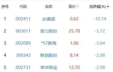 必康退、诺力股份、*ST新海、联创股份、萃华珠宝位列涨幅榜后五位,涨幅分别为-10.14%、-5.12%、-3.64%、-2.98%、-2.98%。
