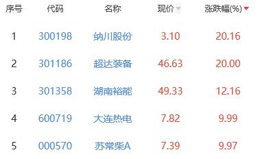 其中,纳川股份、超达装备、湖南裕能、大连热电、苏常柴A位列板块涨幅前五位,涨幅分别为20.16%、20.00%、12.16%、9.99%、9.97%。