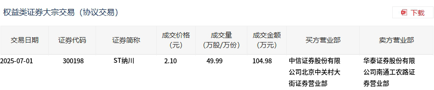 ST纳川今日大宗交易折价成交49.99万股,成交额104.98万元