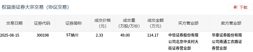ST纳川今日大宗交易平价成交49万股,成交额114.17万元