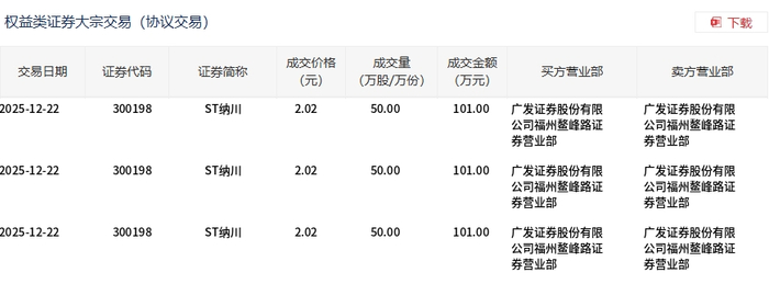 12月22日,ST纳川大宗交易成交150万股,成交额303万元,占当日总成交额的7.32%,成交价2.02元,较市场收盘价2.52元折价19.84%。