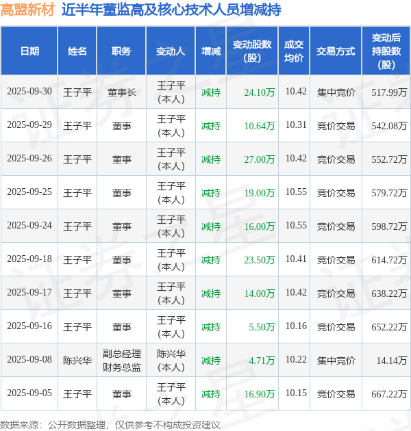 高盟新材:9月30日高管王子平减持股份合计24.1万股