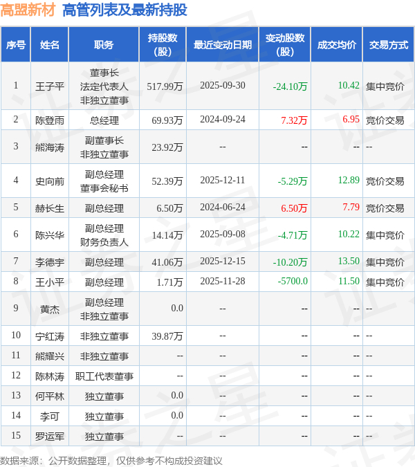 高盟新材近半年内的董监高及核心技术人员增减持详情如下: