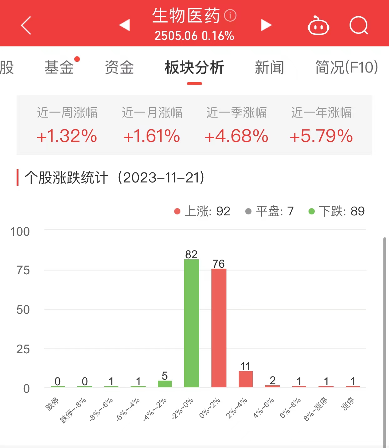 数据显示,截至今日,生物医药板块近一周涨幅1.32%,近一月涨幅1.61%,近一季涨幅4.68%。