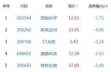 西陇科学(维权)、新莱应材(维权)、ST吉药(维权)、康鹏科技、海特生物位列涨幅榜后五位,涨幅分别为-7.75%、-4.90%、-3.38%、-2.83%、-2.48%。