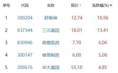 其中,舒泰神、三元基因、森萱医药、香雪制药、华大基因位列板块涨幅前五位,涨幅分别为19.96%、13.41%、6.06%、5.08%、4.85%。