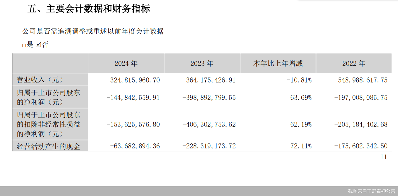 3月25日,舒泰神对外披露了公司2024年年报。财务数据显示,公司报告期内实现的营业收入约为3.25亿元,同比下降10.81%;对应实现的归属净利润约为-1.45亿元,上年同期为-3.99亿元,同比实现减亏。