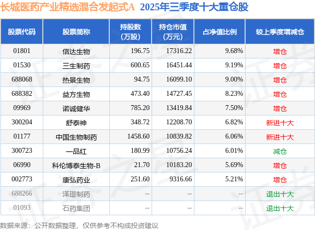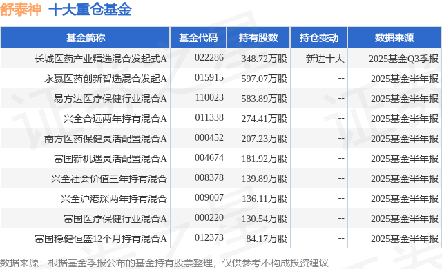 根据2025基金Q3季报公募基金重仓股数据,重仓该股的公募基金共1家,其中持有数量最多的公募基金为长城基金的长城医药产业精选混合发起式A。长城医药产业精选混合发起式A目前规模为3.8亿元,最新净值1.7983(10月22日),较上一交易日下跌0.76%。该公募基金现任基金经理为梁福睿。梁福睿在任的基金产品包括:长城港股医疗保健精选混合发起(QDII)A,管理时间为2025年8月20日至今,期间收益率为-9.96%。