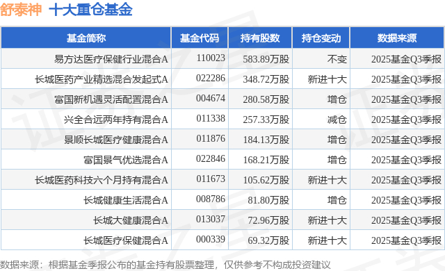 根据2025基金Q3季报公募基金重仓股数据,重仓该股的公募基金共19家,其中持有数量最多的公募基金为易方达基金的易方达医疗保健行业混合A。易方达医疗保健行业混合A目前规模为38.02亿元,最新净值3.798(12月31日),较上一交易日下跌0.55%,近一年上涨24.69%。该公募基金现任基金经理为杨桢霄。杨桢霄在任的基金产品包括:易方达全球医药行业混合发起式(QDII)A(人民币),管理时间为2020年1月20日至今,期间收益率为23.3%;易方达医药生物股票A,管理时间为2020年11月4日至今,期间收益率为-20.01%;易方达港股通医药混合A,管理时间为2025年12月25日至今,期间收益率为nan%。