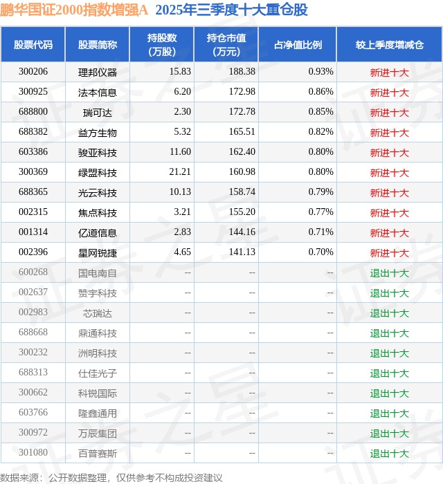 鹏华国证2000指数增强A的前十大重仓股如下: