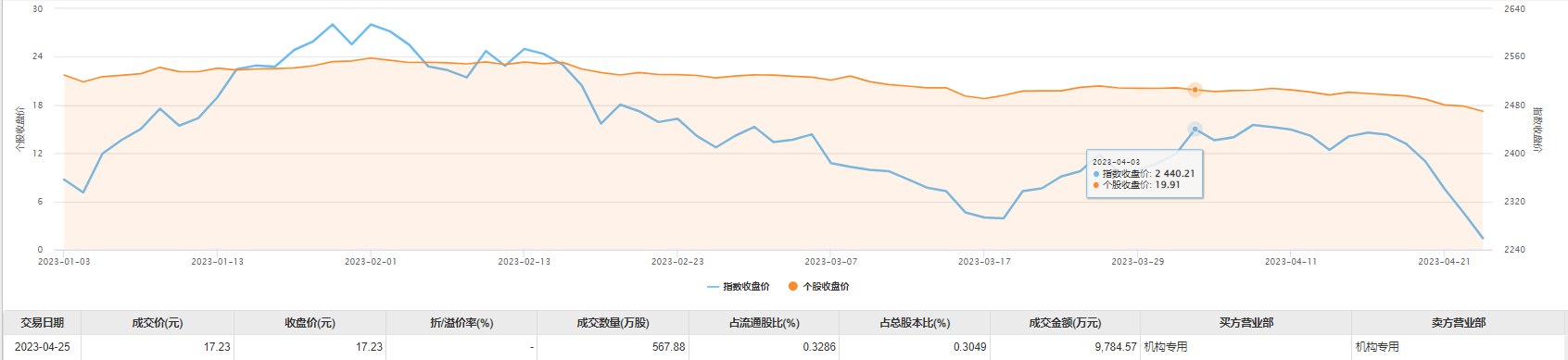 4月25日大宗交易成交567.88万股,成交额9784.57万元,占当日总成交额的15.46%,成交价17.23元,较市场收盘价17.23元持平。