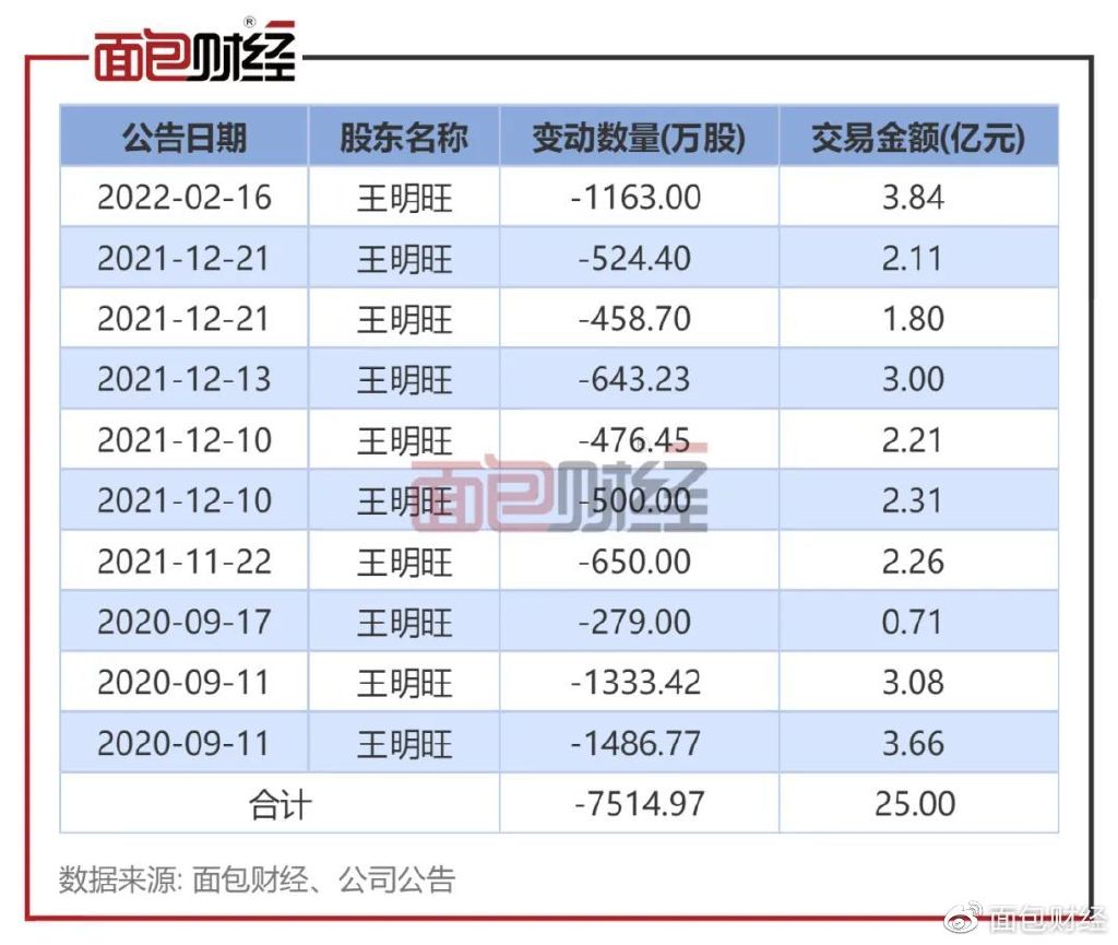 根据信披数据统计,2020年9月至2022年2月期间,实控人王明旺累计减持约7514.97万股,累计交易金额约25亿元。