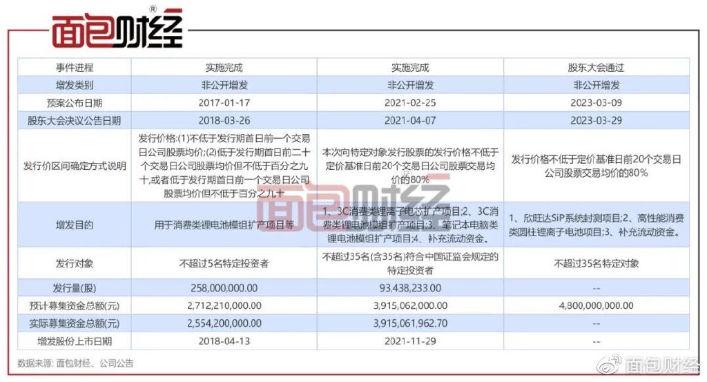 2023年3月9日,欣旺达发布定增预案,拟定增不超约5.59亿股,募资总额不超48亿元。