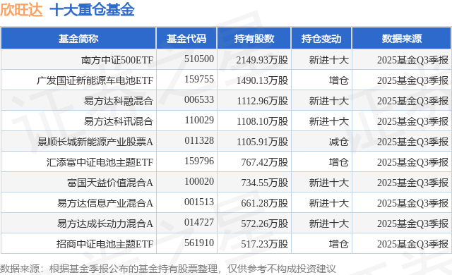 根据2025基金Q3季报公募基金重仓股数据,重仓该股的公募基金共124家,其中持有数量最多的公募基金为南方基金的南方中证500ETF。南方中证500ETF目前规模为400.98亿元,最新净值7.3133(11月4日),较上一交易日下跌1.7%,近一年上涨23.37%。该公募基金现任基金经理为罗文杰。罗文杰在任的基金产品包括:南方中证500ETF联接(LOF)A,管理时间为2013年4月22日至今,期间收益率为144.74%;南方沪深300ETF,管理时间为2013年5月17日至今,期间收益率为152.76%;南方沪深300ETF联接A,管理时间为2013年5月17日至今,期间收益率为138.27%。