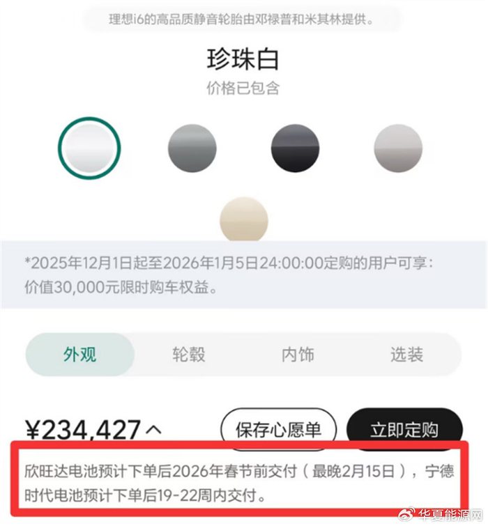 在理想i6定购界面写明——搭载欣旺达电池的车型交付周期在6周内,而搭载宁德时代电池的车型交付周期为19-22周,这意味着,用户选择宁德时代电池版本的汽车,需要等待更长时间。即使是这样,有已经支付定金的理想车主,在发现车辆装载的是欣旺达电池后,选择放弃提车并要回定金。