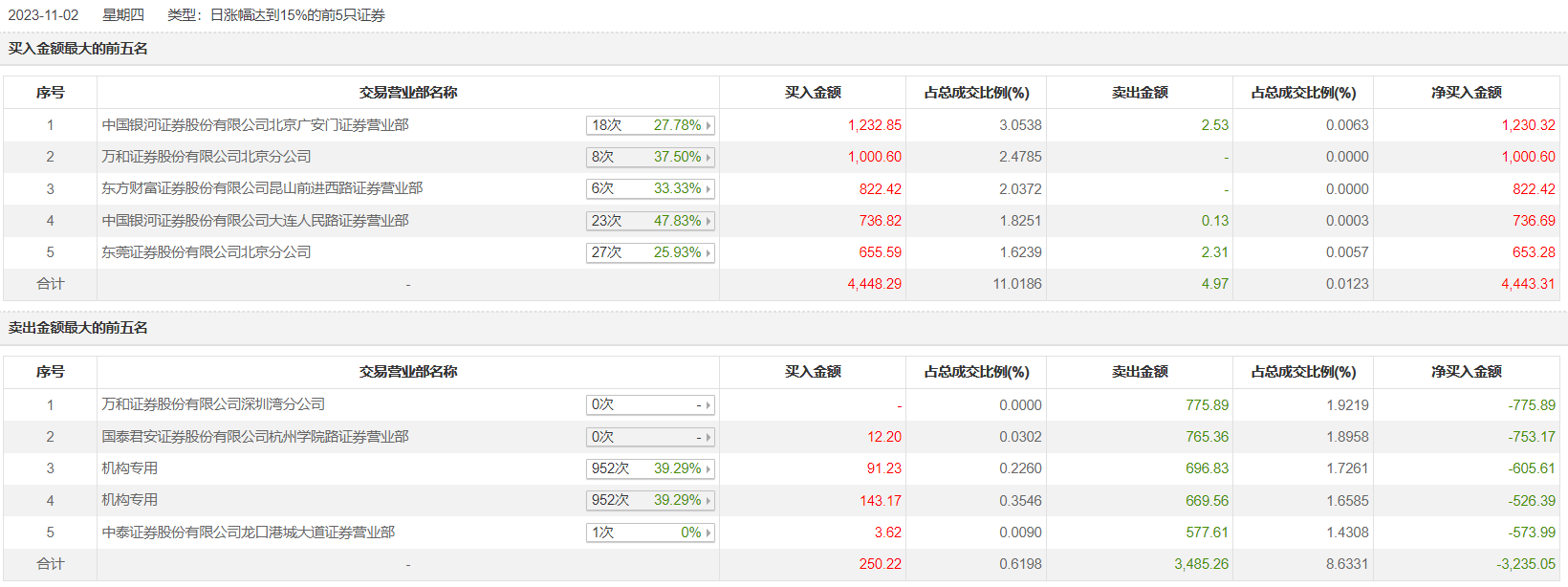 具体来看,机构买入234.39万元,卖出1366.39万元,合计净卖出1132.0万元。此外,知名游资现身龙虎榜,著名刺客(东莞证券股份有限公司北京分公司)净买入653.28万元。此外,中国银河证券北京广安门证券营业部、万和证券北京分公司分别买入1232.85万元、1000.60万元;万和证券深圳湾分公司、国泰君安证券杭州学院路证券营业部分别卖出775.89万元、765.36万元。