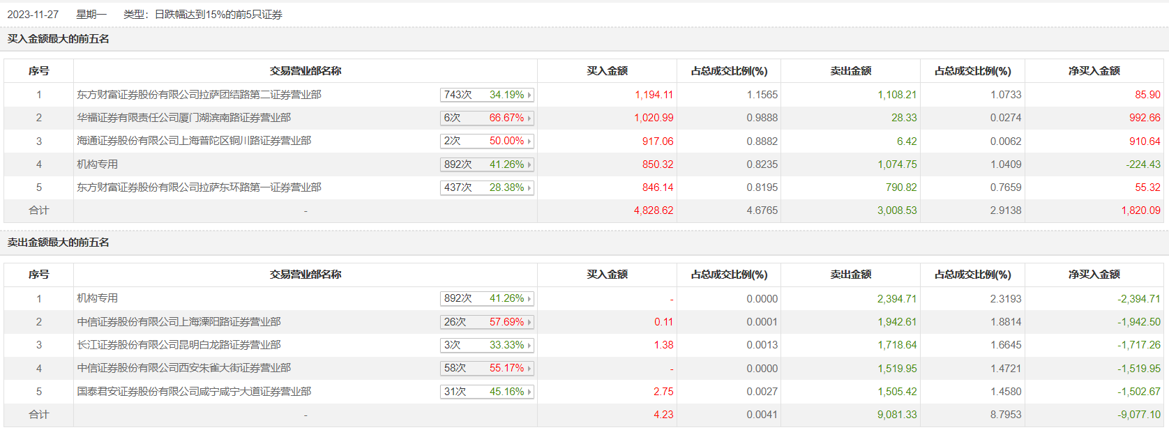森远股份11月27日跌停,龙虎榜数据显示,上榜营业部席位全天成交1.69亿元,占当日总成交金额比例为16.39%。其中,买入金额为4832.85万元,卖出金额为1.21亿元,合计净卖出7257.0万元。具体来看,机构买入850.32万元,卖出3469.47万元,合计净卖出2619.14万元。此外,知名游资现身龙虎榜,孙哥(中信证券上海溧阳路证券营业部)、长江证券昆明白龙路证券营业部分别卖出1942.61万元、1718.64万元;东方财富证券拉萨团结路第二证券营业部、华福证券厦门湖滨南路证券营业部分别买入1194.11万元、1020.99万元。