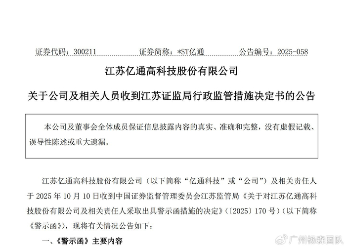 2025年10月10日,江苏亿通高科技股份有限公司(亿通科技或公司)披露,收到江苏证监局行政监管措施决定书的公告。