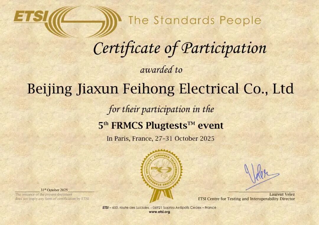 10月31日,为期5天的第5次FRMCS(Future Railway Mobile Communication System,国际铁路联盟下一代铁路移动通信系统标准)Plugtests(互通性测试)在法国巴黎圆满落幕。作为全球铁路通信领域建设的核心参与者,北京佳讯飞鸿电气股份有限公司(以下简称“佳讯飞鸿”,股票代码:300213)本次参与了客户端MCX Client、服务端MCX AS以及调度设备Dispatcher三种设备的测试工作,并通过多场景互操作性验证。