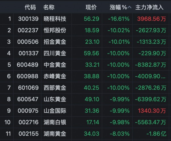 贵金属概念股早间继续重挫,板块指数开盘低开逾10%。板块内所有个股下跌,恒邦股份、招金黄金、四川黄金、中金黄金等集体一字跌停。