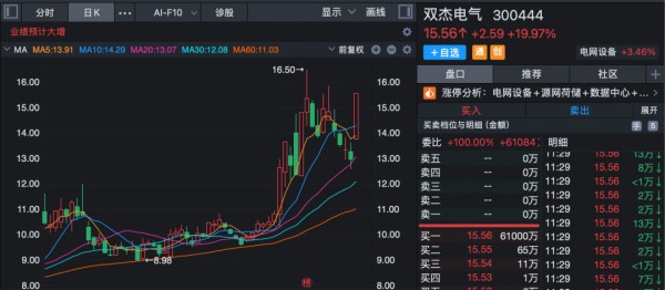 电网设备股早间全线逆市走强,板块指数高开高走,盘中一度放量涨逾4%,半日成交超前一交易日全天成交。双杰电气(300444)20%涨停,顺钠股份、白云电器、杭电股份等多股一字涨停,积成电子则开盘后仅约3分钟垂直涨停,亿能电力、大连电瓷等超逾10股也涨停或涨超10%。