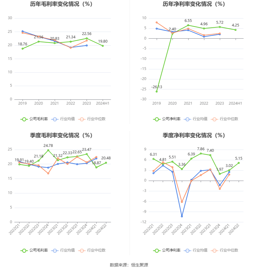 2024年上半年,公司毛利率为19.80%,同比下降2.10个百分点;净利率为4.25%,较上年同期下降2.99个百分点。从单季度指标来看,2024年第二季度公司毛利率为20.48%,同比下降1.85个百分点,环比上升1.61个百分点;净利率为5.15%,较上年同期下降2.71个百分点,较上一季度上升2.13个百分点。