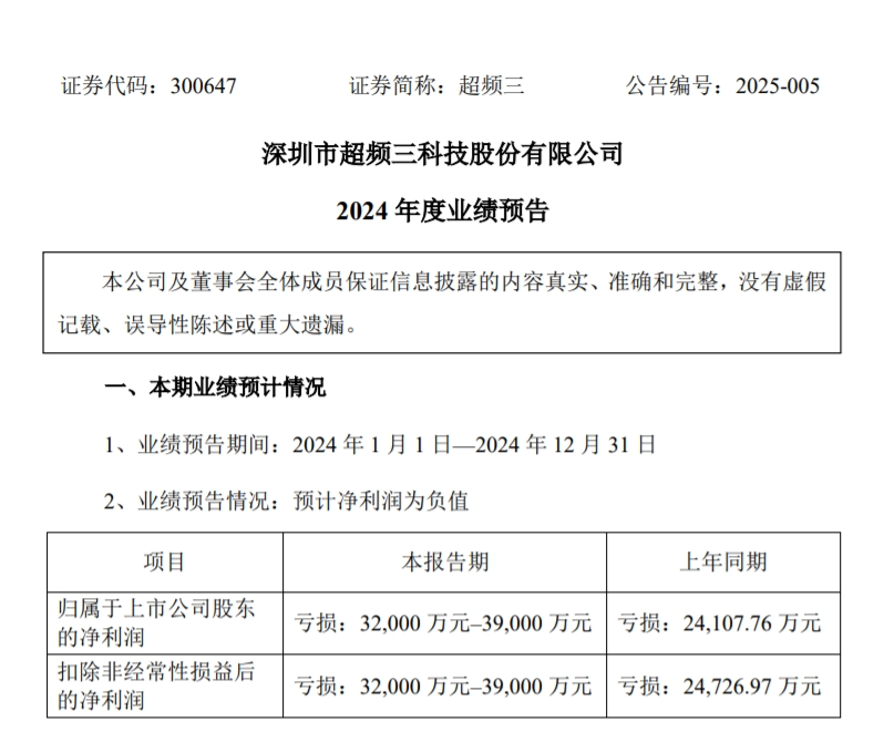 1月18日,超频三发布2024年度业绩预告。预计2024年度归属于上市公司股东的净利润将出现亏损,亏损区间为3.2亿元至3.9亿元。报告期,超频三核心业务锂离子电池材料业务所属行业竞争加剧,需求增速低于预期,公司产品价格持续承压,导致毛利下降、经营亏损。