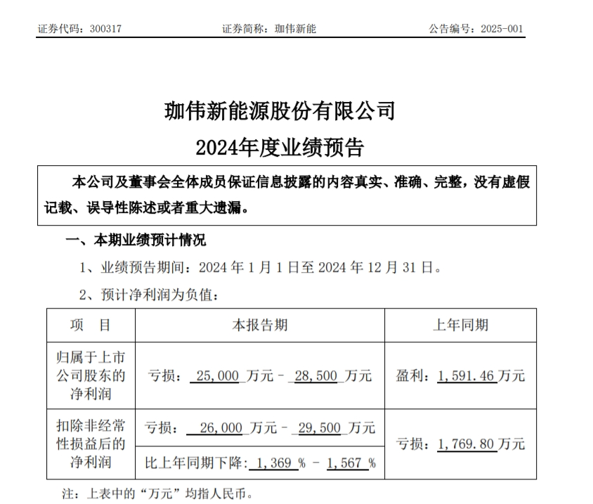 1月15日,珈伟新能发布2024年度业绩预告。预计2024年归属于上市公司股东的净利润将亏损2.5亿元至2.85亿元。扣除非经常性损益后的净利润亏损范围在2.6亿元至2.95亿元之间,同比亏损幅度进一步扩大。