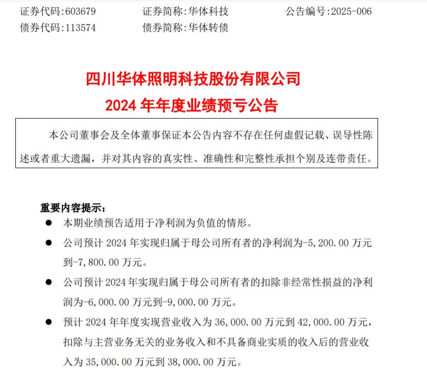 1月18日,华体科技发布2024年度业绩预告。预计2024年归母净利润为-5,200万元到-7,800万元,与上年同期相比,将出现亏损。华体科技表示,本期主要受市场环境影响,整体行情不景气,市场上的项目存在减少及延期情况,导致公司收入减少,经营业绩出现大幅下降,公司预计亏损。