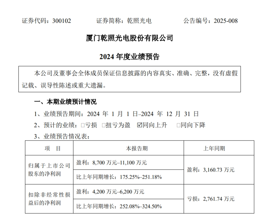 1月21日,乾照光电发布2024年度业绩预告。预计2024年度归母净利润为8700万元至1.11亿元,同比增长175.25%至251.18%。扣除非经常性损益后的净利润预计为4200万元至6200万元,与上年同期的亏损2761.74万元相比,实现了大幅扭亏为盈。乾照光电表示,公司致力于产品结构转型、发展第二增长曲线,中、高端产品的收入占比持续提升。