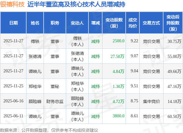 银禧科技近半年内的董监高及核心技术人员增减持详情如下: