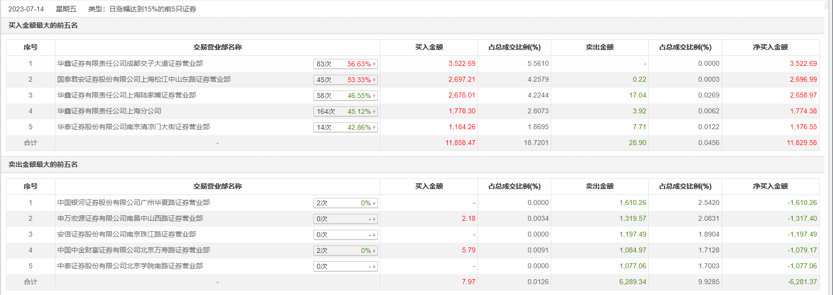 具体来看,华鑫证券成都交子大道证券营业部、国泰君安证券上海松江中山东路证券营业部分别买入3522.69万元、2697.21万元;中国银河证券广州华夏路证券营业部、申万宏源证券有限公司南昌中山西路证券营业部分别卖出1610.26万元、1319.57万元。