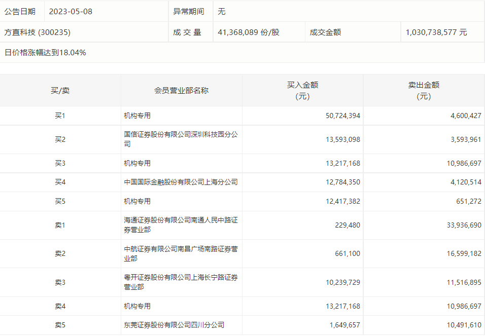 5月8日,方直科技今日涨18.04%,龙虎榜数据显示,上榜营业部席位全天成交2.12亿元,占当日总成交金额比例为20.57%。其中,买入金额为1.16亿元,卖出金额为9649.72万元,合计净买入1901.91万元。