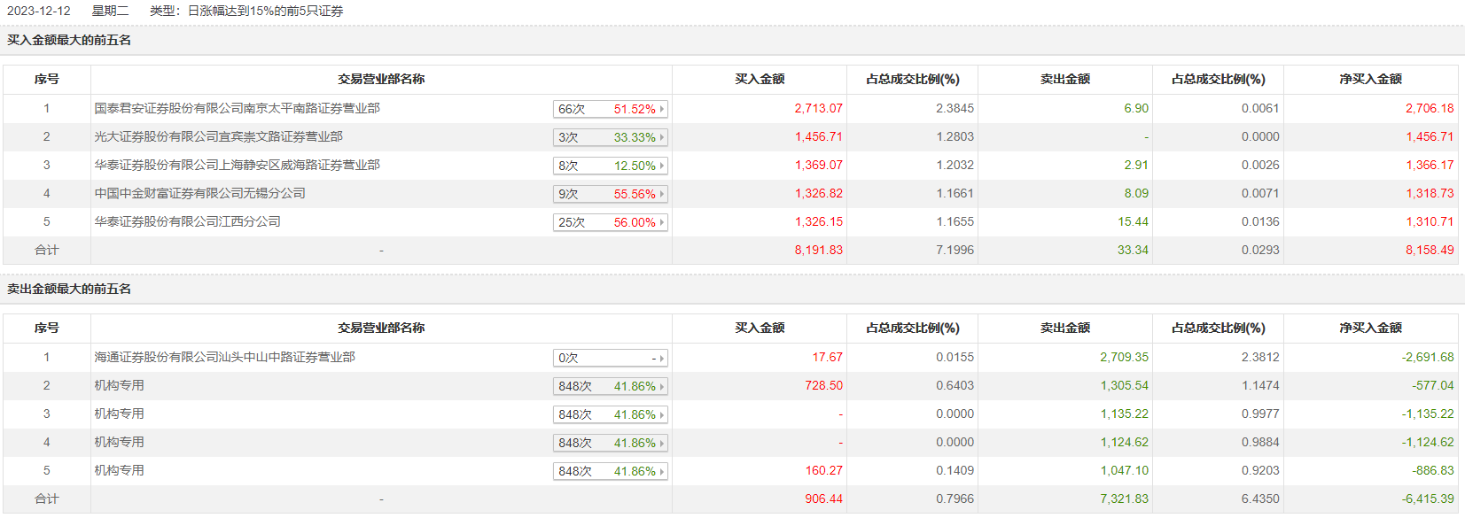 具体来看,机构买入888.77万元,卖出4612.48万元,合计净卖出3723.71万元。此外,知名游资现身龙虎榜,作手新一(国泰君安证券南京太平南路证券营业部)、光大证券(维权)宜宾崇文路证券营业部分别买入2713.07万元、1456.71万元;海通证券汕头中山中路证券营业部、华泰证券江西分公司分别卖出2709.35万元、15.44万元。
