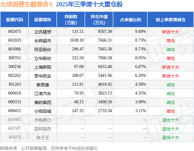 根据2025基金Q3季报公募基金重仓股数据,重仓该股的公募基金共10家,其中持有数量最多的公募基金为大成基金的大成消费主题混合A。大成消费主题混合A目前规模为7.74亿元,最新净值2.1231(1月6日),较上一交易日上涨0.45%,近一年上涨14.41%。该公募基金现任基金经理为齐炜中。齐炜中在任的基金产品包括:大成景阳领先混合A,管理时间为2020年2月3日至今,期间收益率为109.0%;大成一带一路灵活配置混合A,管理时间为2021年3月17日至今,期间收益率为31.94%;大成蓝筹稳健混合A,管理时间为2021年6月21日至今,期间收益率为-1.1%。