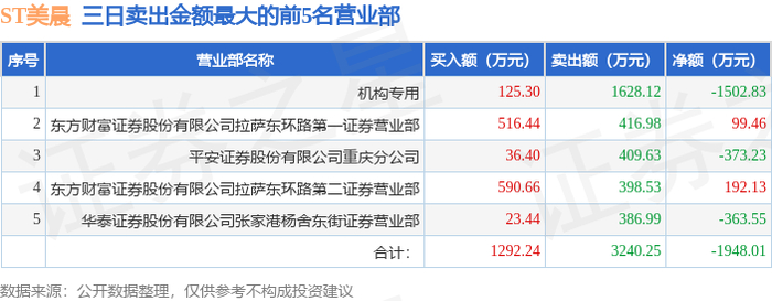 10月9日ST美晨(300237)龙虎榜数据:机构净卖出1502.83万元(3日)