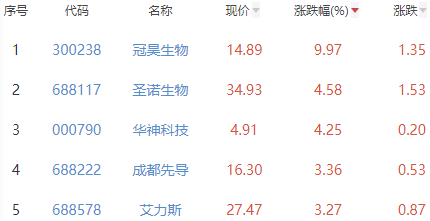 其中,冠昊生物、圣诺生物、华神科技、成都先导和艾力斯位列板块涨幅前五位,涨幅分别为9.97%、4.58%、4.25%、3.36%和3.27%。