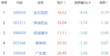 金石亚药、亨迪药业、诺诚健华、普莱柯和广生堂位列涨幅榜后五位,涨幅分别为-4.56%、-3.74%、-3.60%、-3.30%和-3.06%。