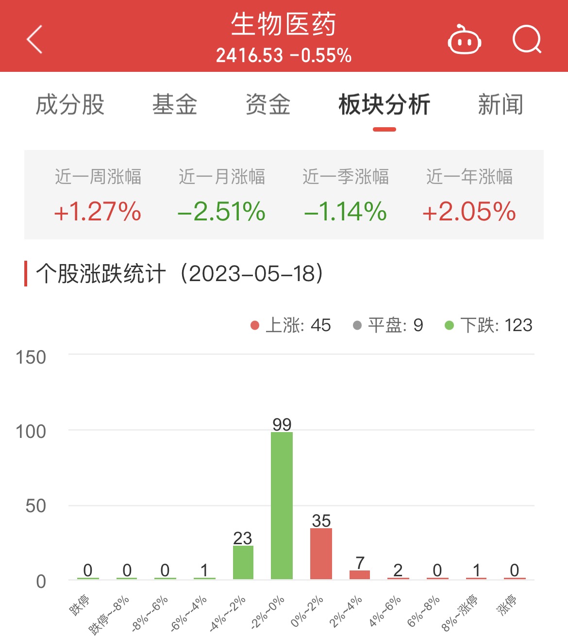 中国经济网北京5月18日讯今日,生物医药板块整体涨幅-0.55%,其中45只股票上涨,9只股票平盘,123只股票下跌。