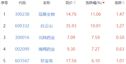 其中,冠昊生物、白云山、北陆药业、海翔药业和珍宝岛位列板块涨幅前五位,涨幅分别为11.06%、10.01%、7.59%、7.27%和6.10%。