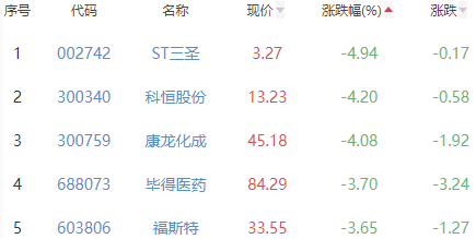 ST三圣、科恒股份、康龙化成、毕得医药和福斯特位列涨幅榜后五位,涨幅分别为-4.94%、-4.20%、-4.08%、-3.70%和-3.65%。