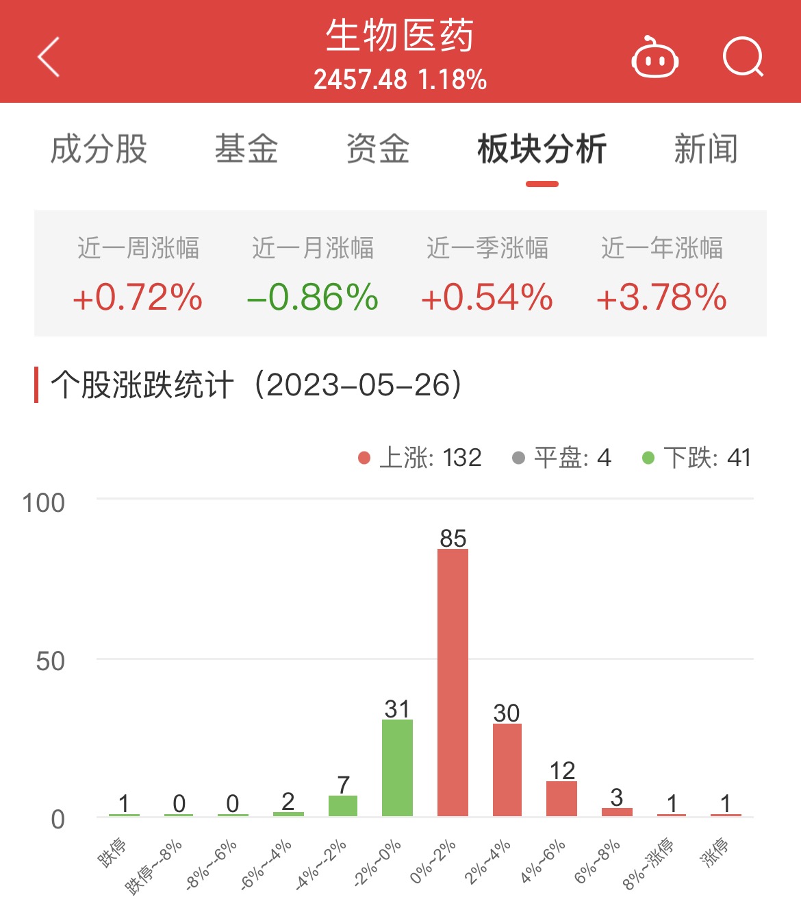 中国经济网北京5月26日讯今日,生物医药板块整体涨幅1.18%,其中132只股票上涨,4只股票平盘,41只股票下跌。