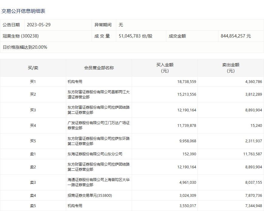 5月29日,冠昊生物今日涨停,龙虎榜数据显示,上榜营业部席位全天成交1.34亿元,占当日总成交金额比例为15.85%。其中,买入金额为7952.8万元,卖出金额为5441.06万元,合计净买入2511.74万元。