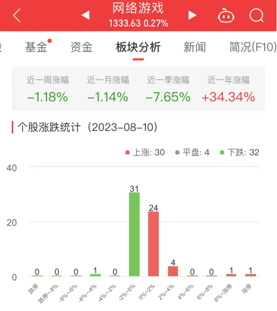 中国经济网北京8月10日讯今日,网络游戏板块整体涨幅0.27%,其中30只股票上涨,4只股票平盘,32只股票下跌。