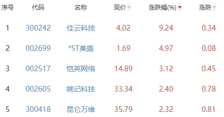 其中,佳云科技、*ST美盛、恺英网络、姚记科技、昆仑万维位列板块涨幅前五位,涨幅分别为9.24%、4.97%、3.12%、2.40%、2.32%。