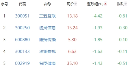 三五互联、初灵信息、博瑞传播、华策影视、名臣健康位列涨幅榜后五位,涨幅分别为-4.42%、-1.93%、-1.85%、-1.63%、-1.43%。